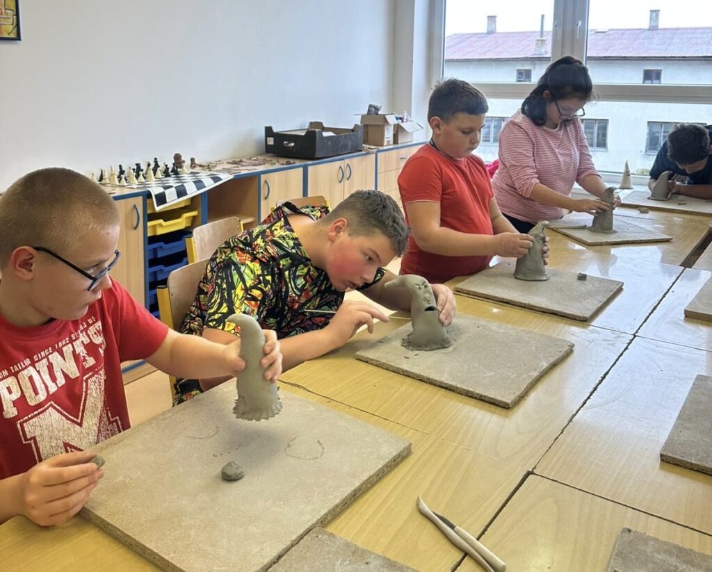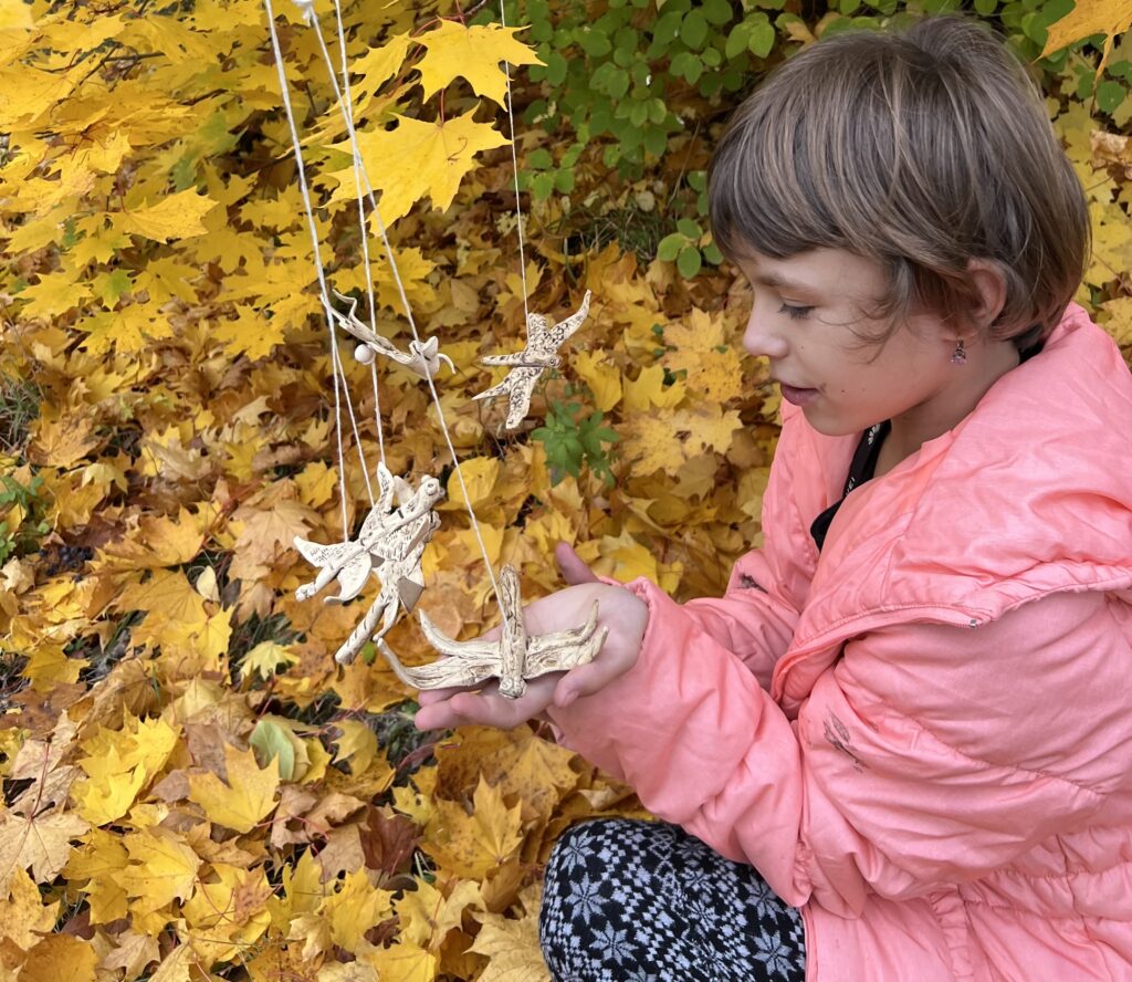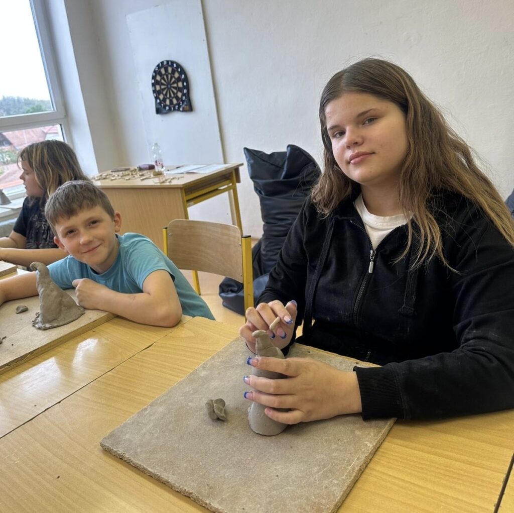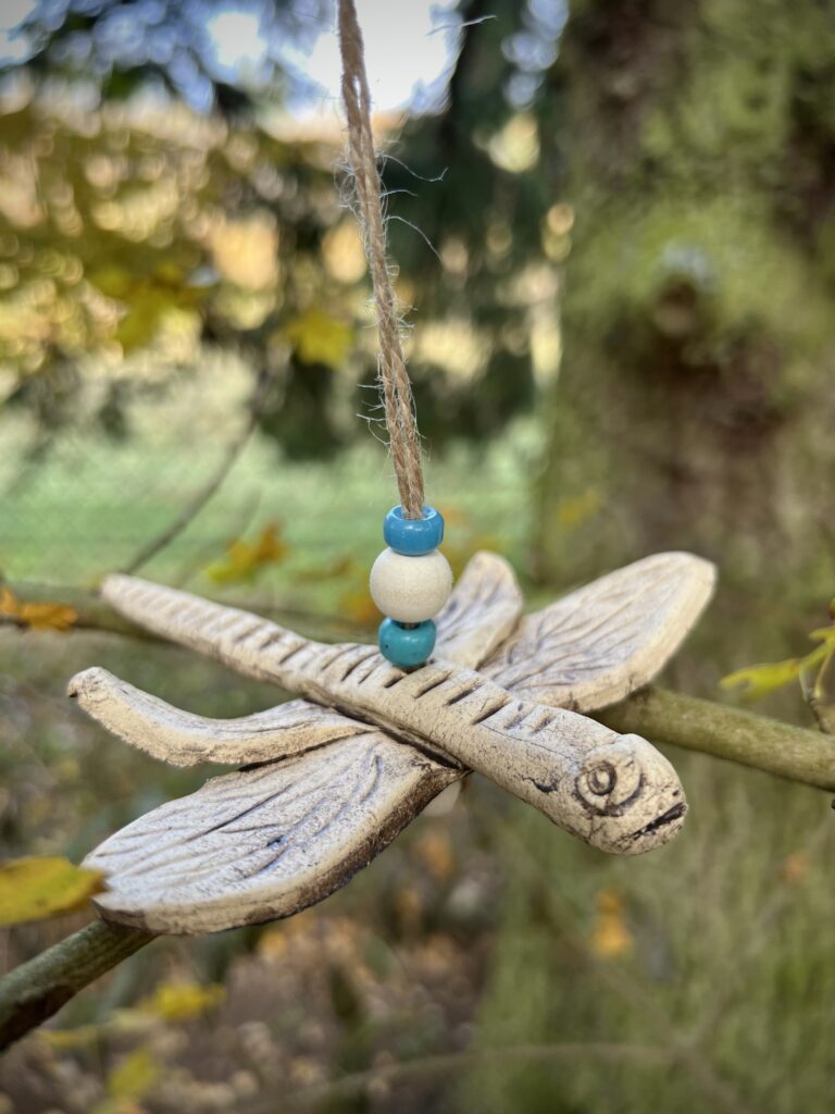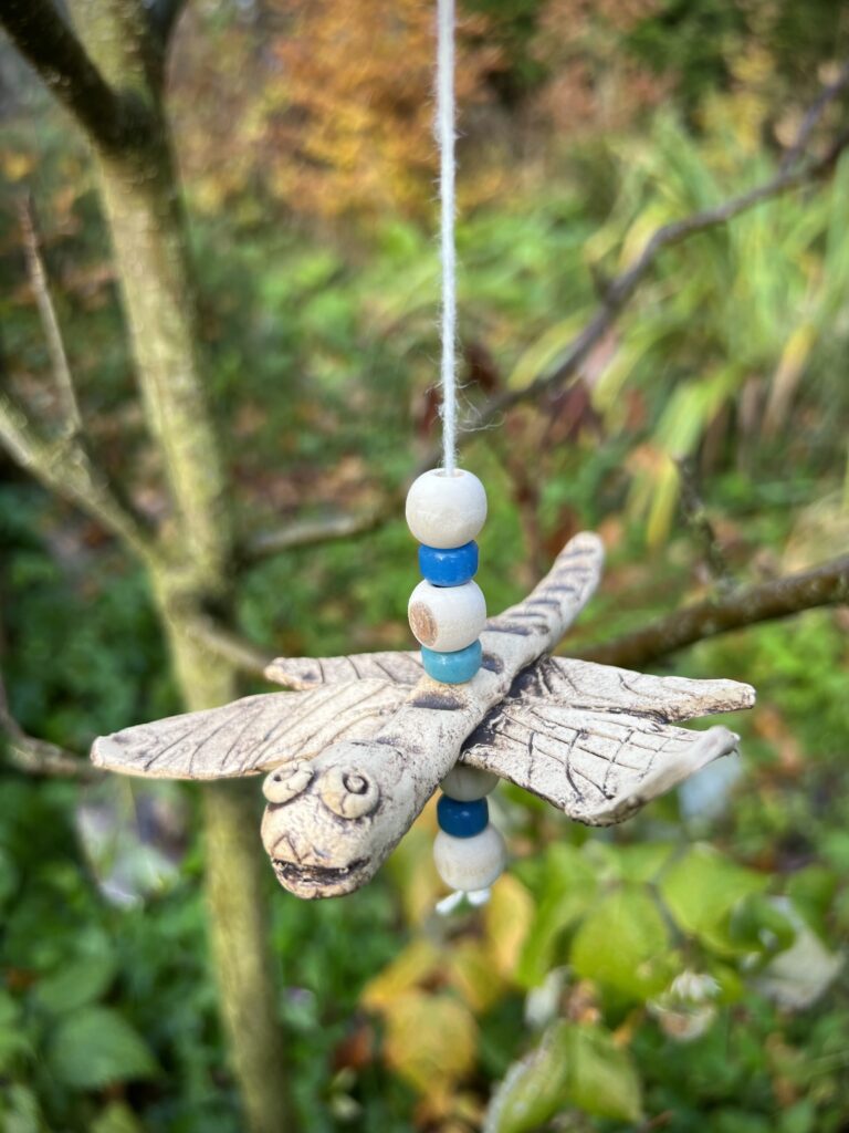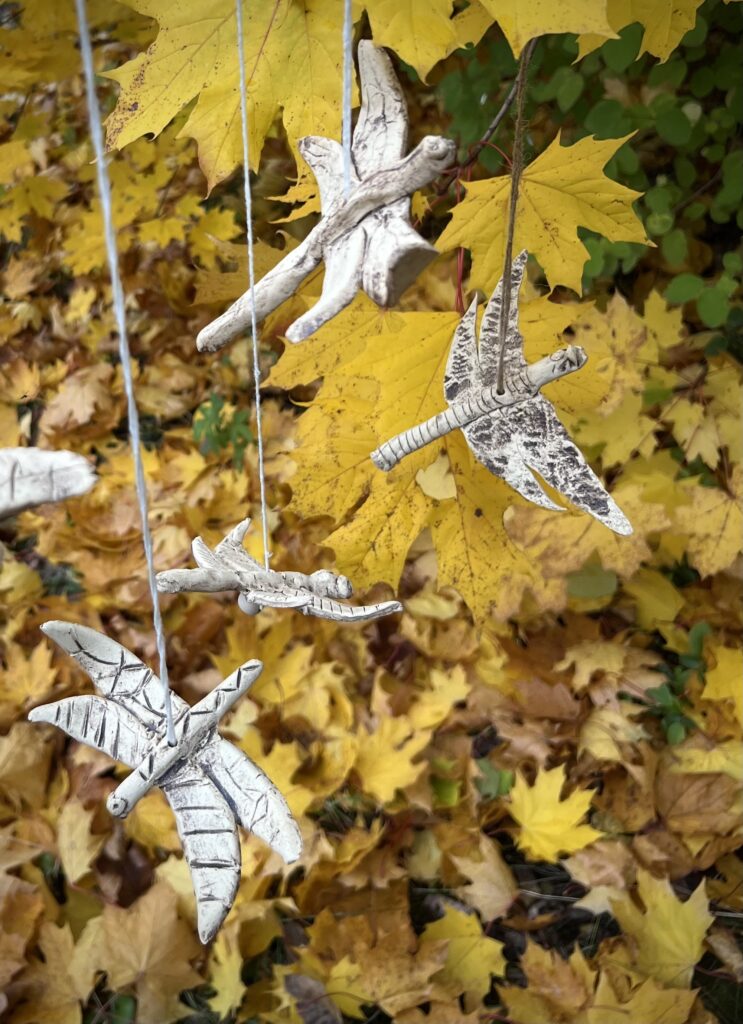 Dostali jsme nápad vytvořit z keramické hlíny vážku. Dvoje křídla, dlouhé tělo, na hlavičku dvě malé oči. Vznikly vážky různých tvarů a velikostí a všechny jsme navázali na provázek s korálkou. Teď se mohou pohupovat jako závěsná ozdoba. Další projekt jsou strašidýlka na čajovou svíčku.