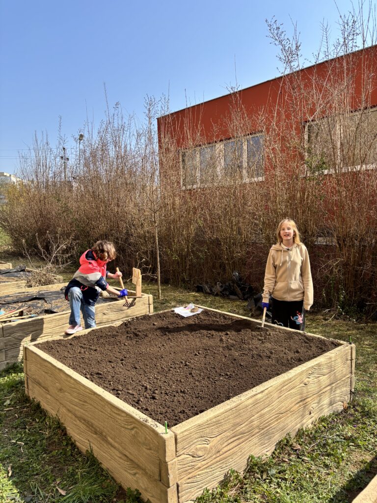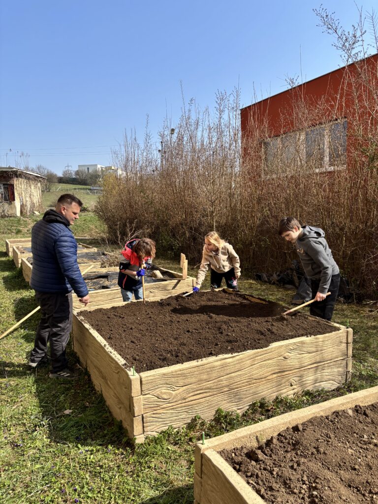 Další část pracovních činností proběhla na školním pozemku. Třída se pustila do přípravy záhonů na jarní sázení. Žáci pracovali s nářadím, odstraňovali plevel, kypřili půdu a chystali vše tak, aby byl pozemek připravený na další práci.