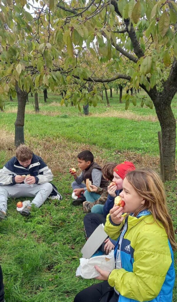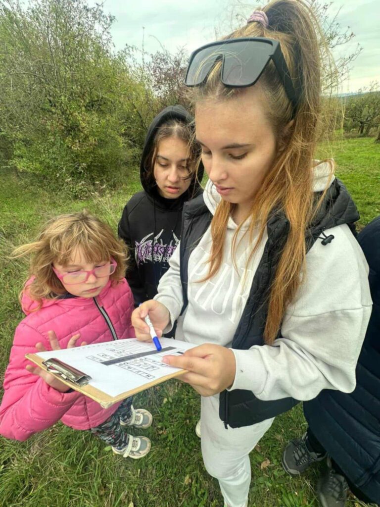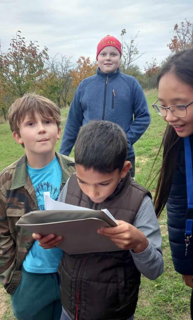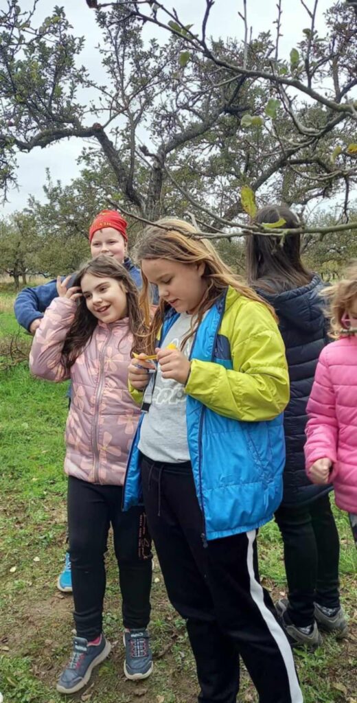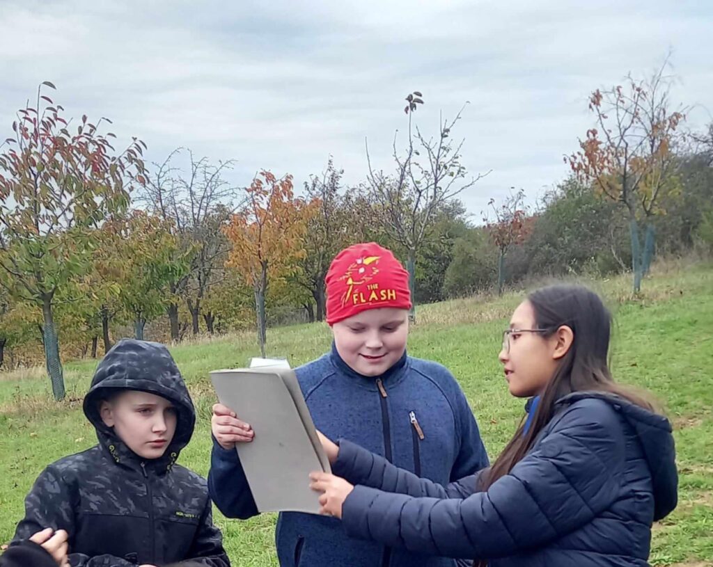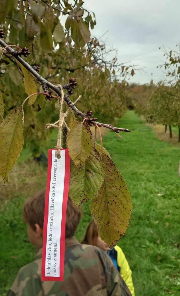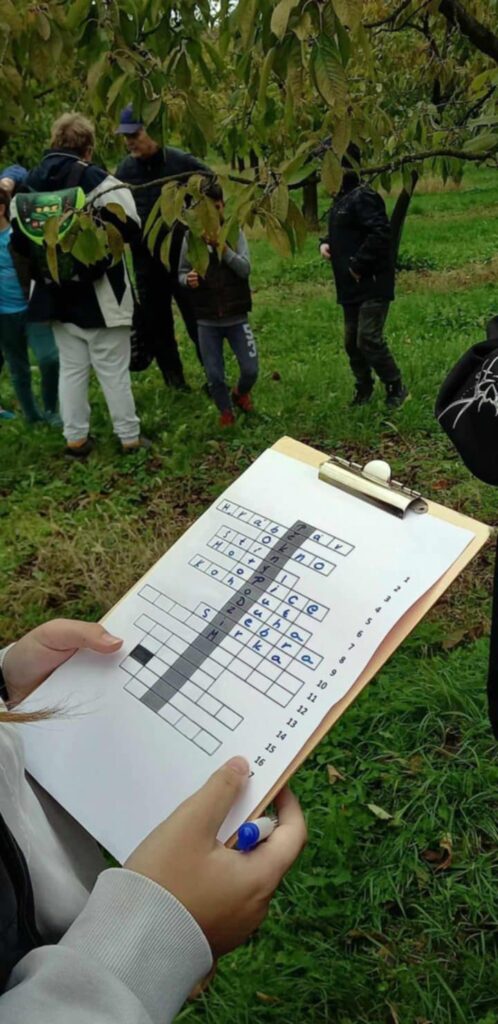 Děvčata z 1. výchovné skupiny a chlapci z 2. výchovné skupiny si zahráli podzimní hru s tajenkou. Procházeli trasu značenou lístečky s hádankou, kterou zapisovali do křížovky. Po uhodnutí sedmnácti hádanek si přečetli tajenku. Oba týmy tajenku vyluštily. Po cestě sadem se děti nasvačily a užily si pohodu a radost.
