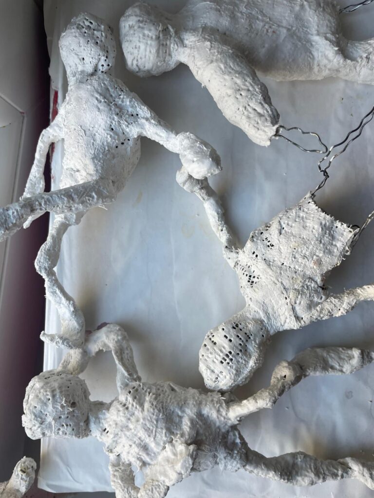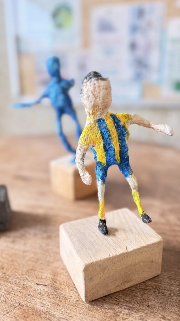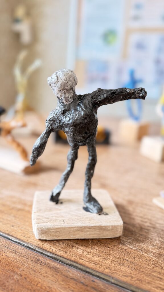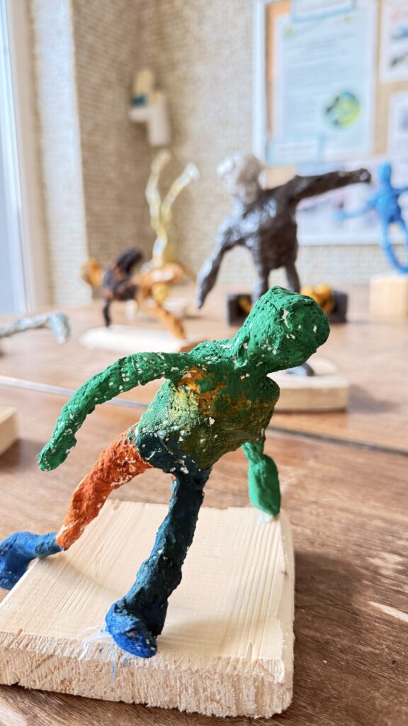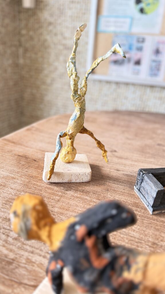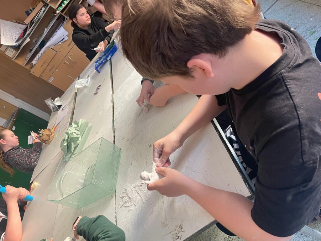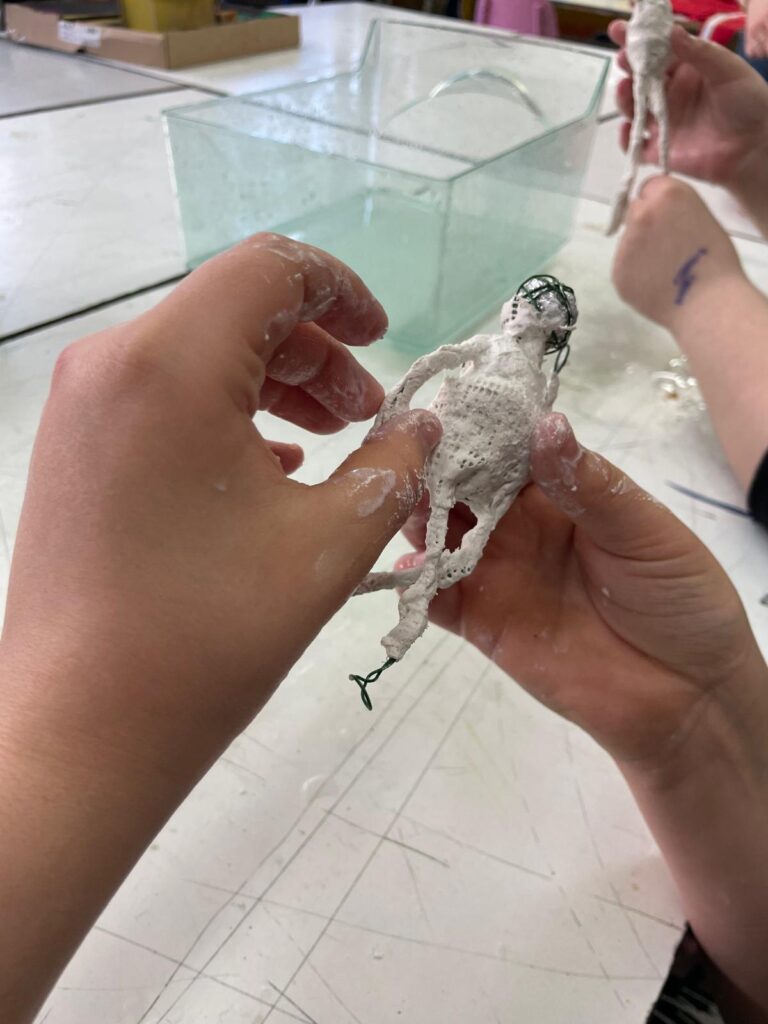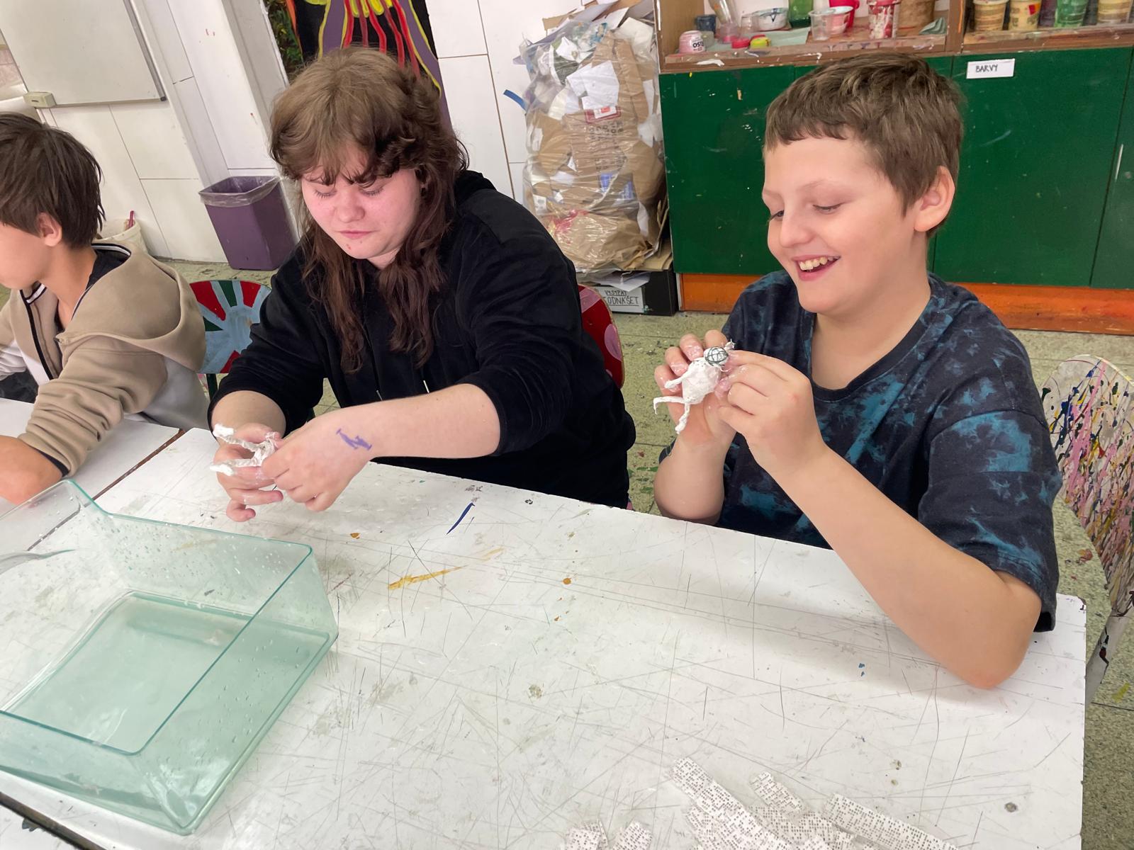 Závěrečná část projektu patřila prostorové tvorbě. Žáci postupně přešli od jednoduché konstrukce z drátů a alobalu až k vytvoření vlastní sádrové sochy. Tu následně výtvarně upravili a umístili na vlastnoručně zhotovený dřevěný podstavec.