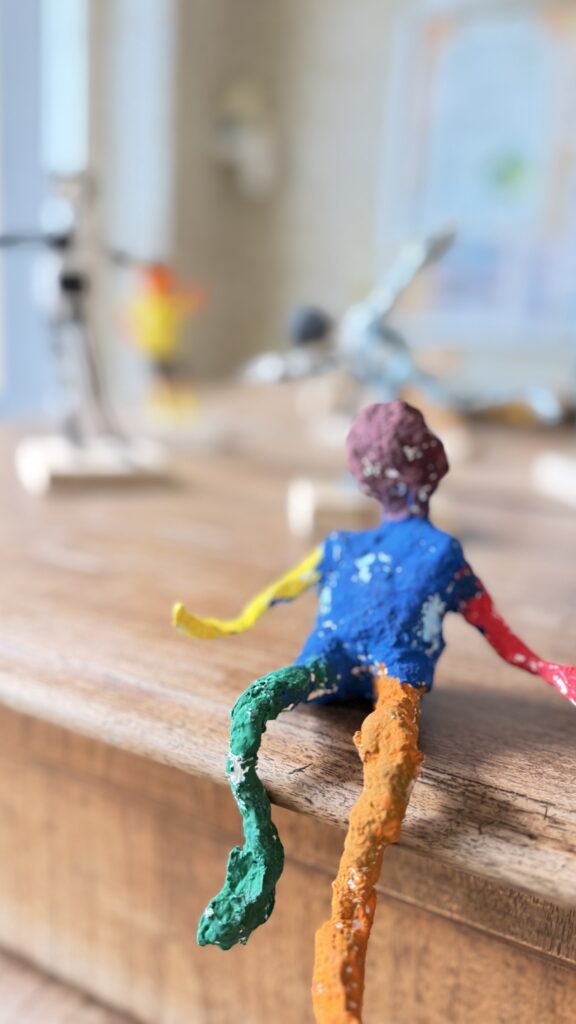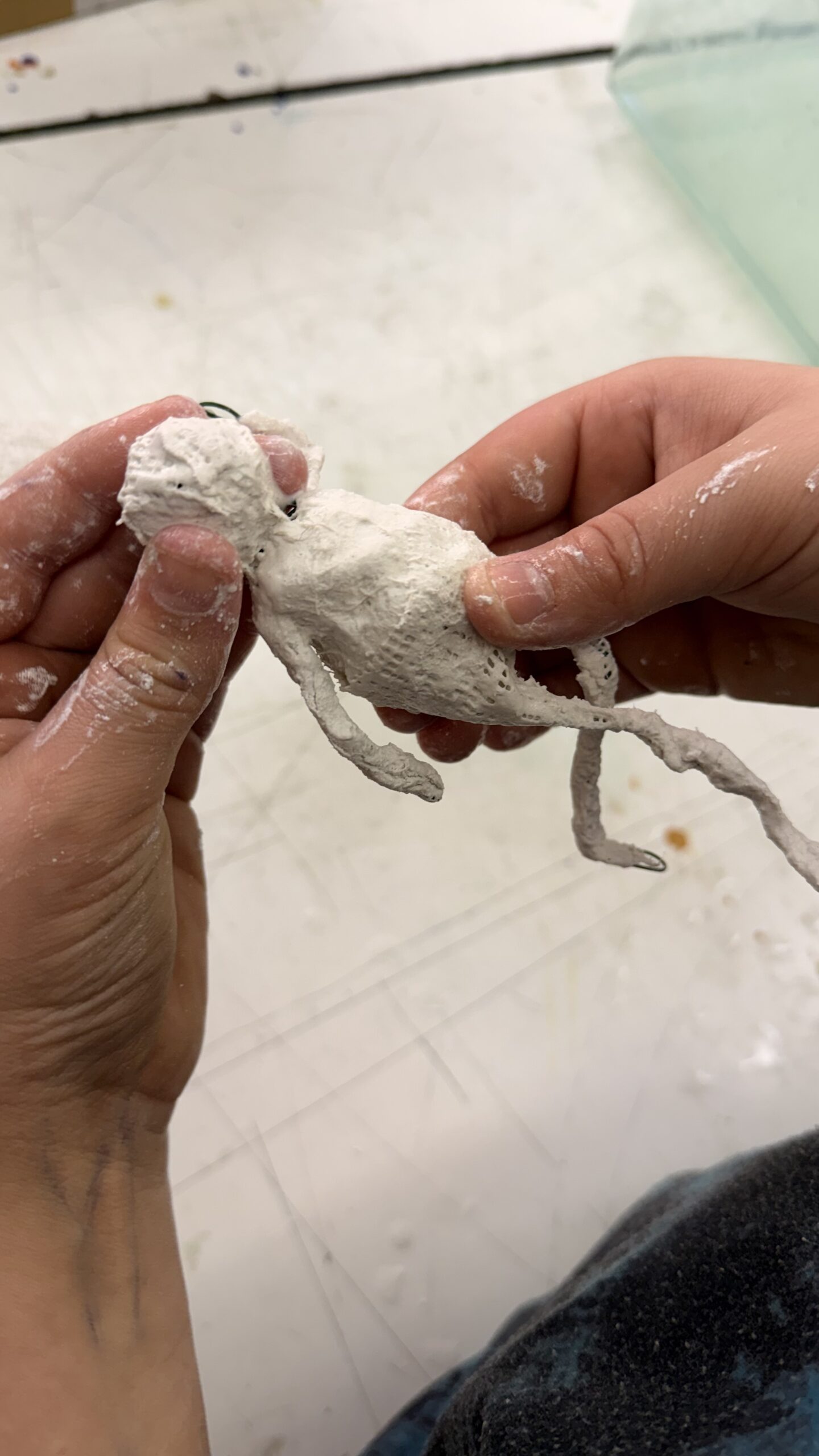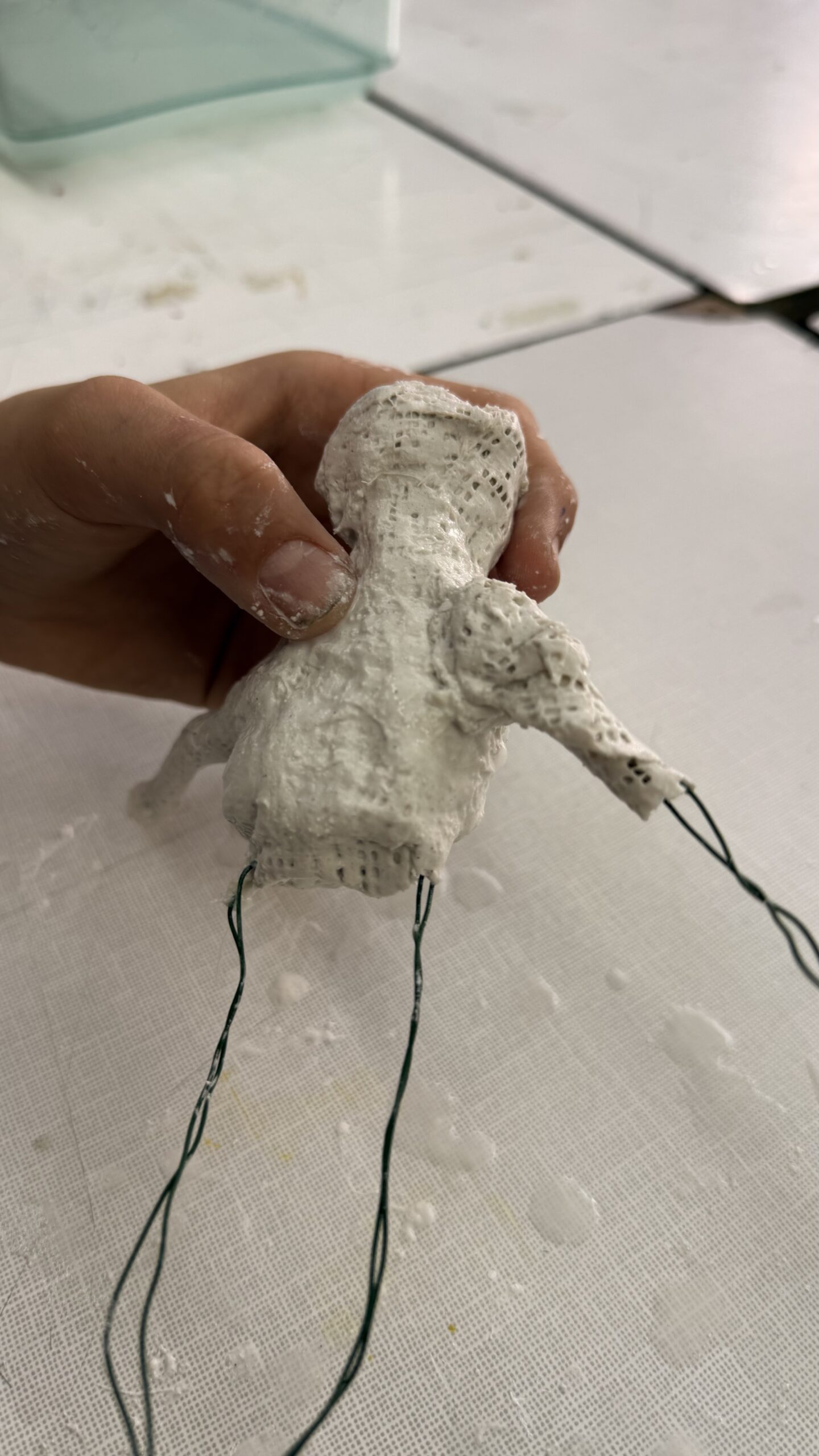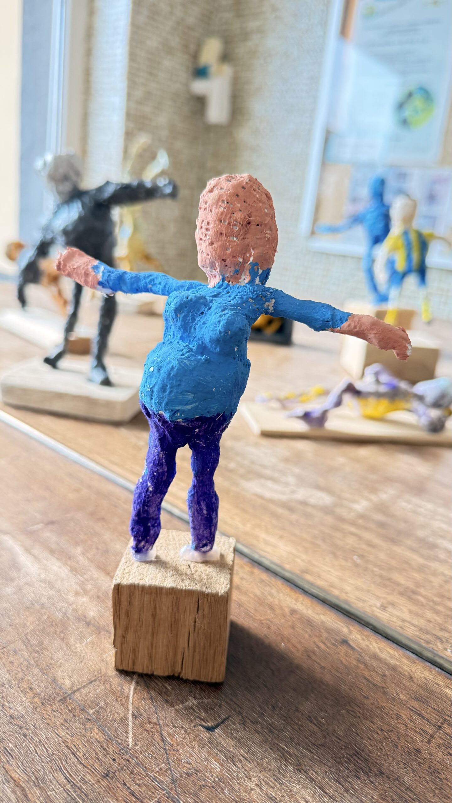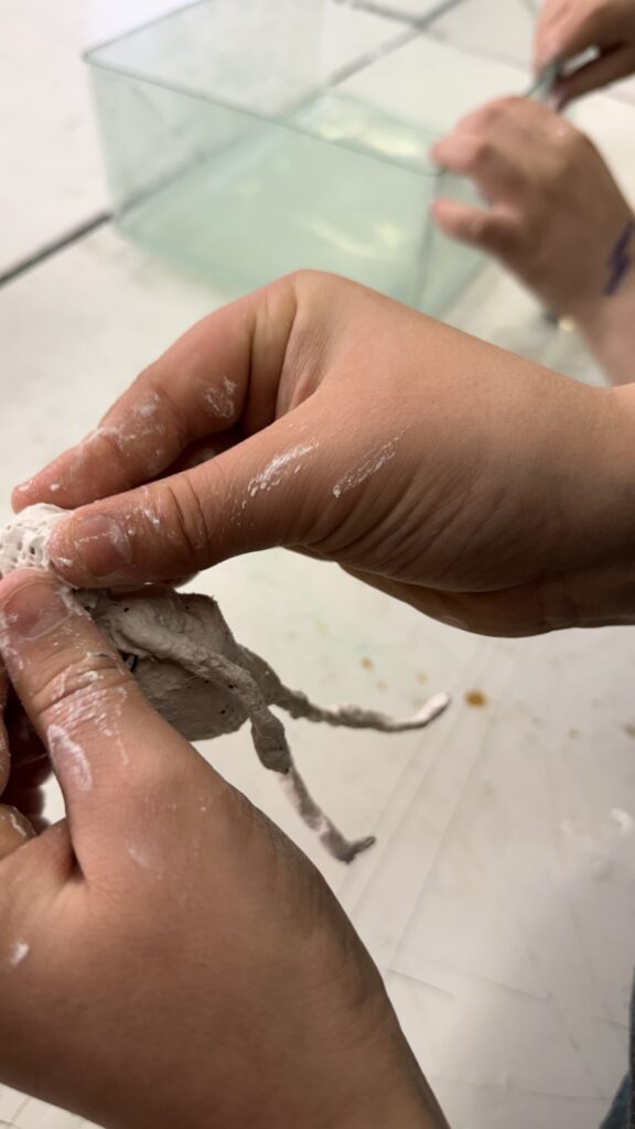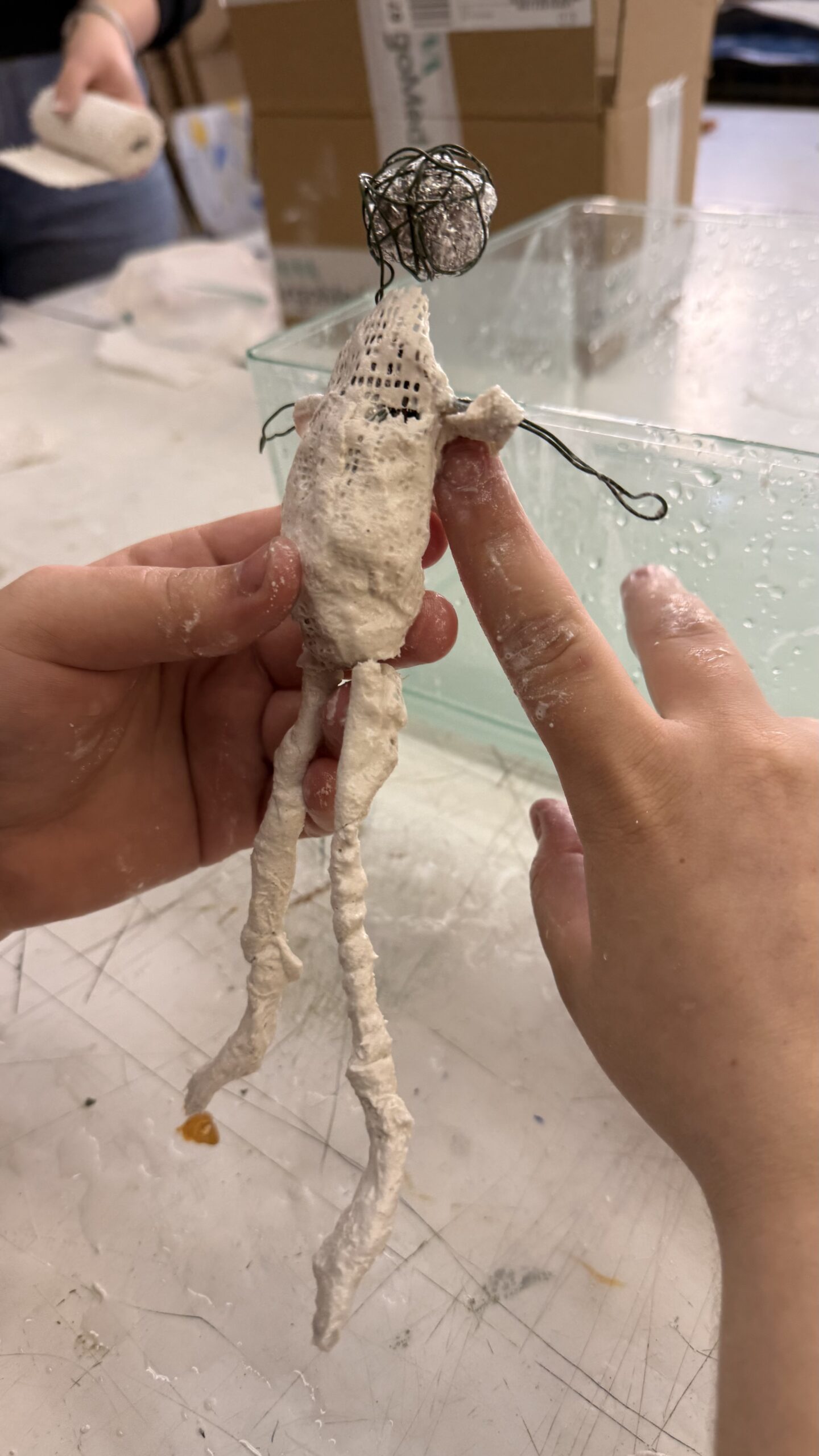 Závěrečná část projektu patřila prostorové tvorbě. Žáci postupně přešli od jednoduché konstrukce z drátů a alobalu až k vytvoření vlastní sádrové sochy. Tu následně výtvarně upravili a umístili na vlastnoručně zhotovený dřevěný podstavec.
