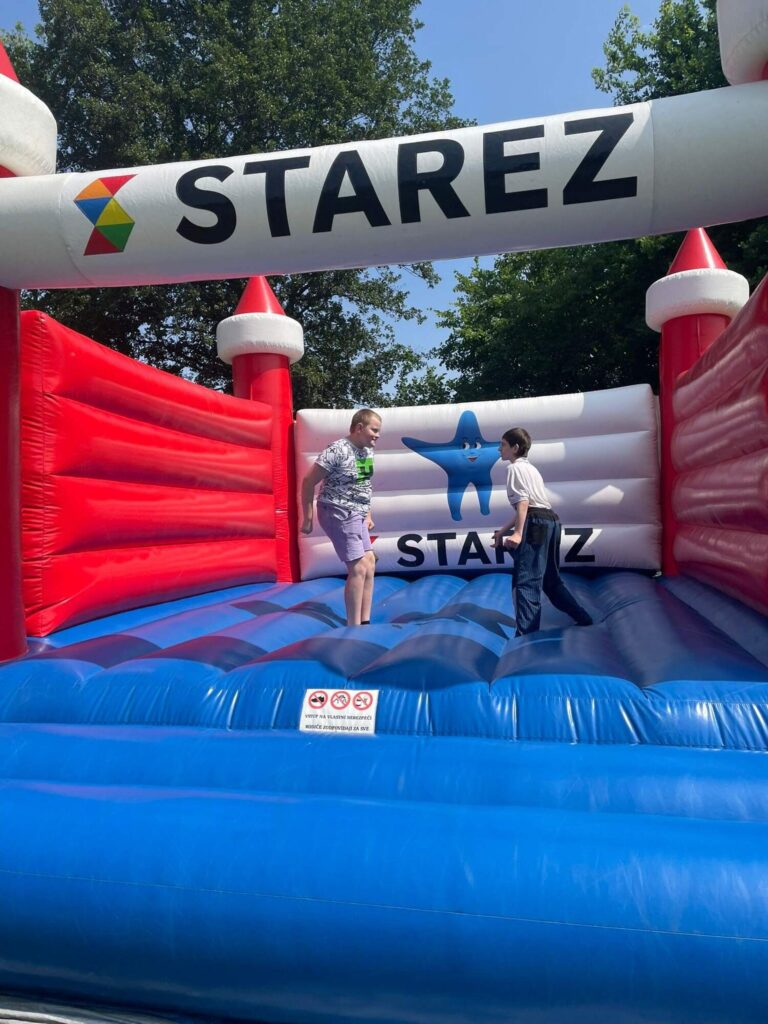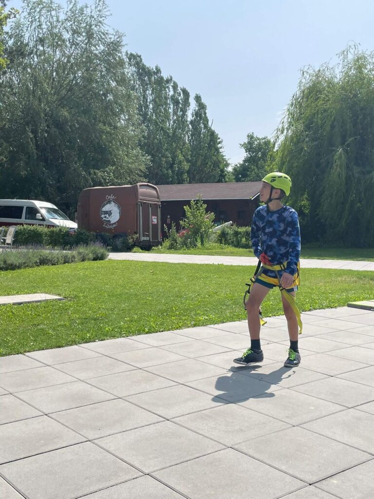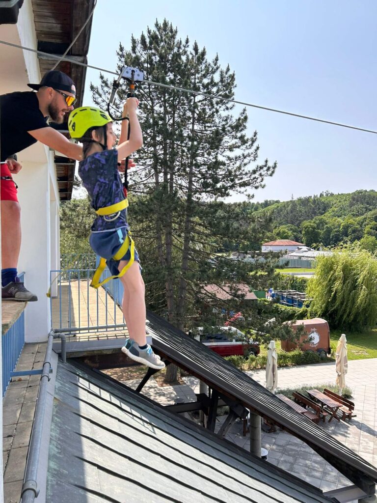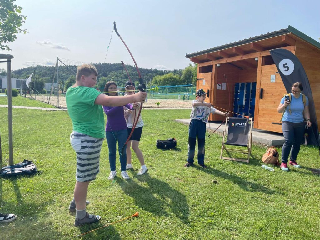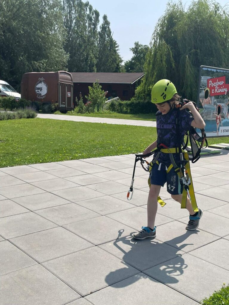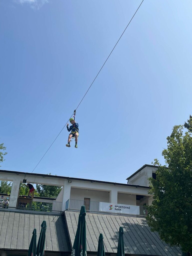 Hned po příchodu na nás čekalo deset rozmanitých stanovišť, která prověřila nejen fyzickou zdatnost, ale i týmového ducha a odvahu. Děti si vyzkoušely atletickou rozcvičku, střelbu z luku, zdolávaly lezeckou stěnu, hrály plážové a míčové hry, a ti nejodvážnější se spustili po 130 metrů dlouhé zipline!
