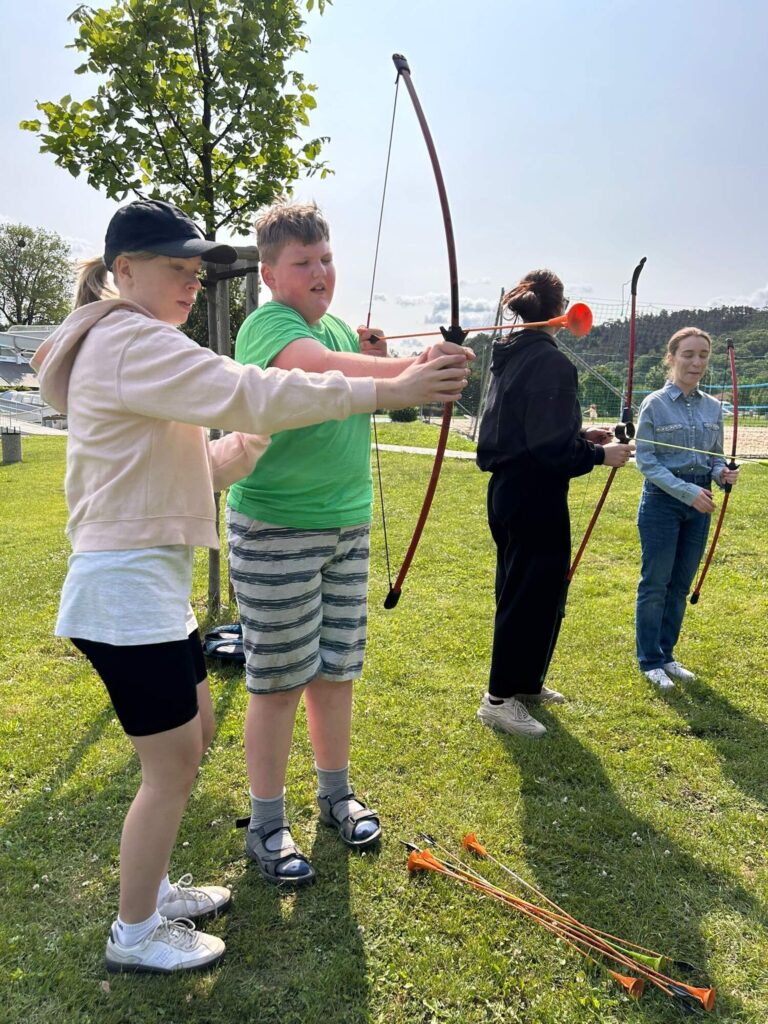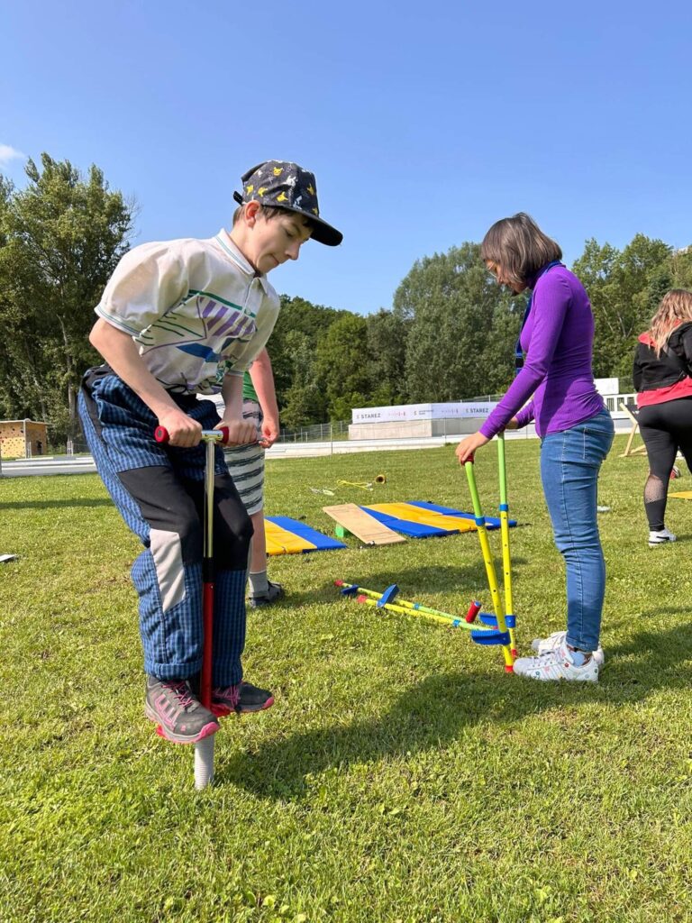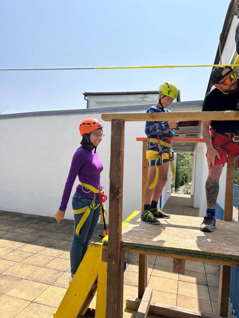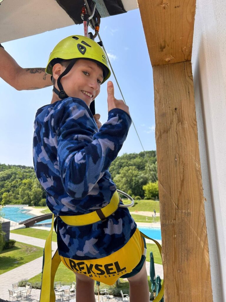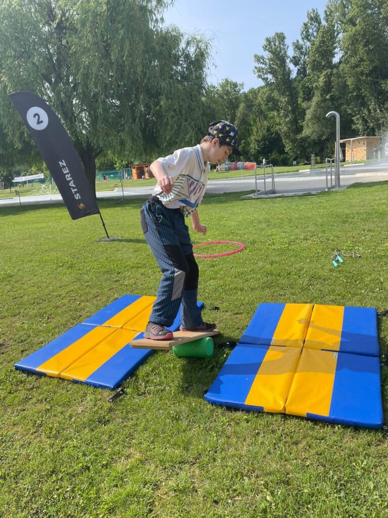 Hned po příchodu na nás čekalo deset rozmanitých stanovišť, která prověřila nejen fyzickou zdatnost, ale i týmového ducha a odvahu. Děti si vyzkoušely atletickou rozcvičku, střelbu z luku, zdolávaly lezeckou stěnu, hrály plážové a míčové hry, a ti nejodvážnější se spustili po 130 metrů dlouhé zipline!