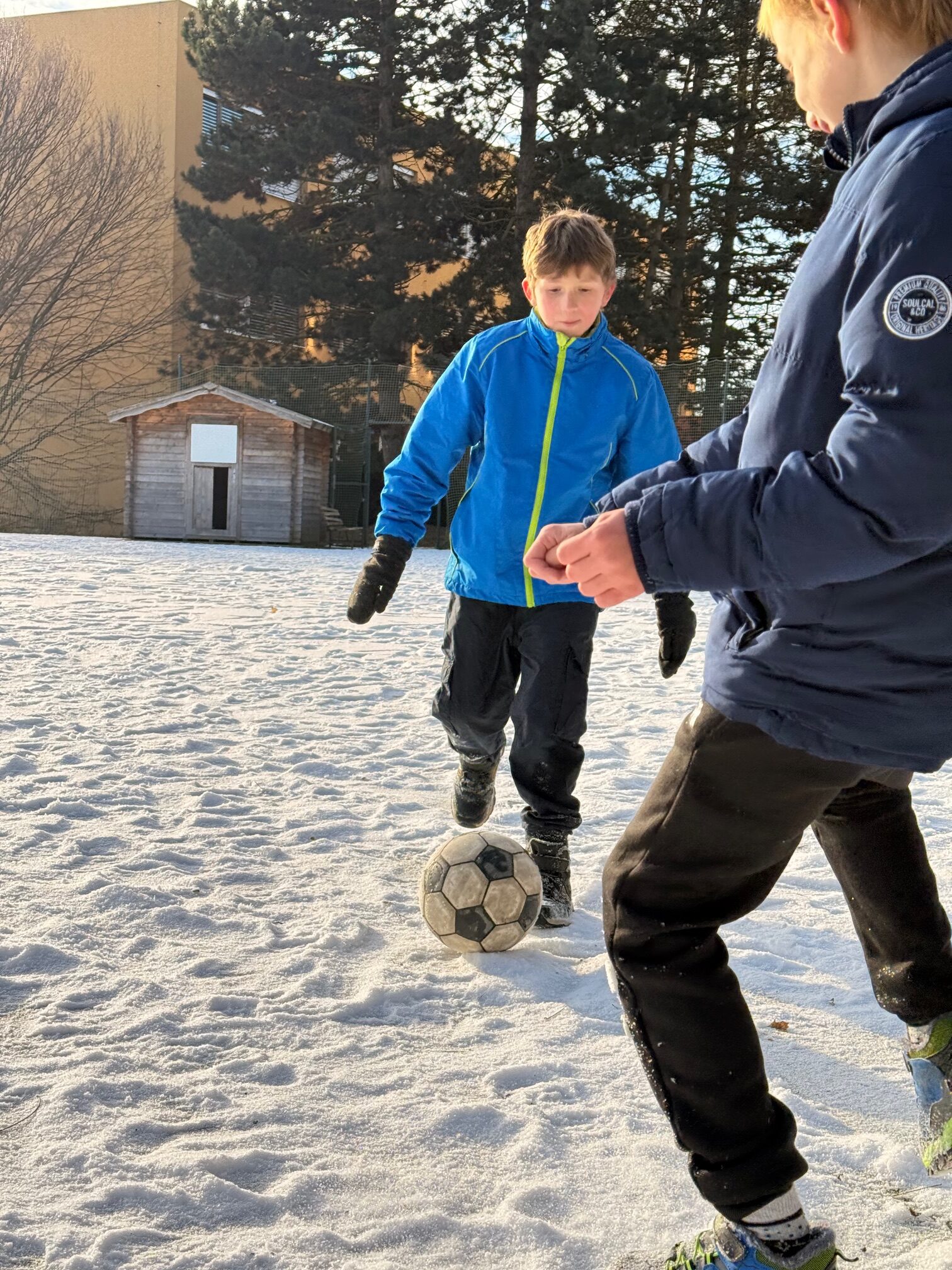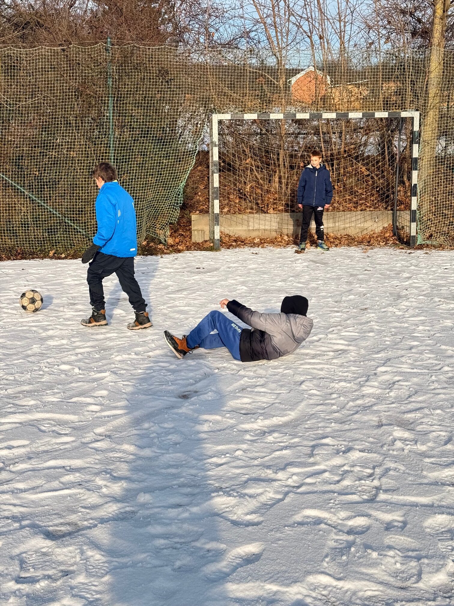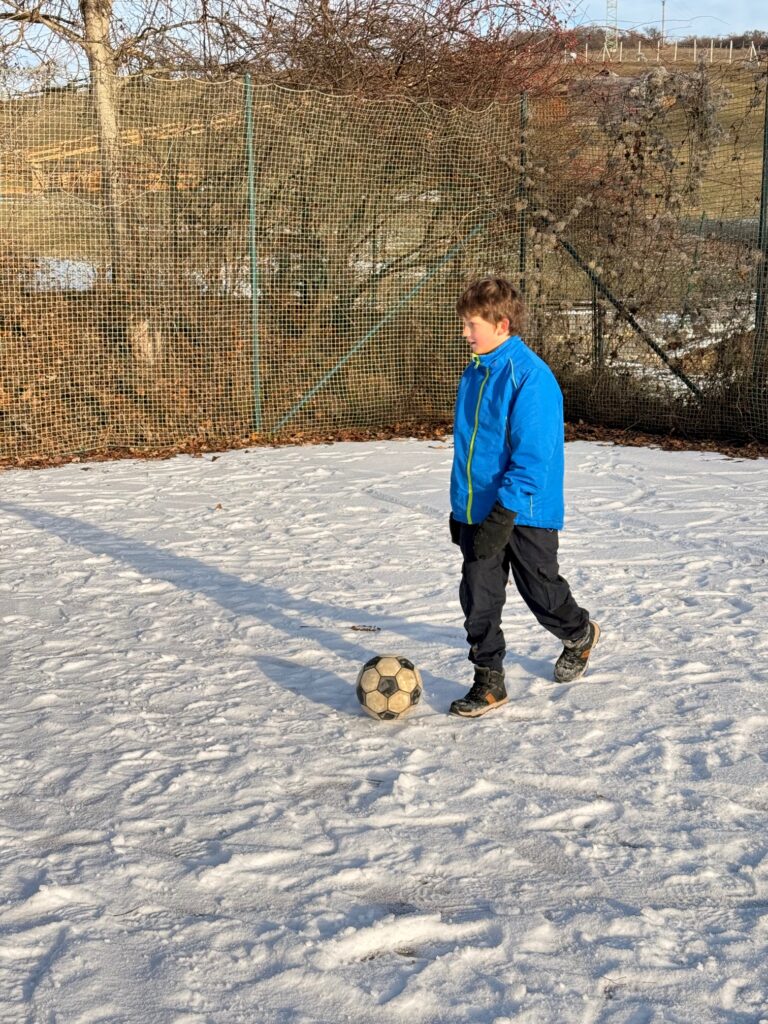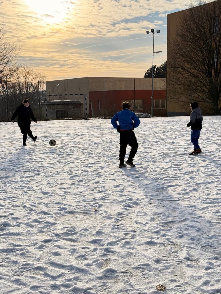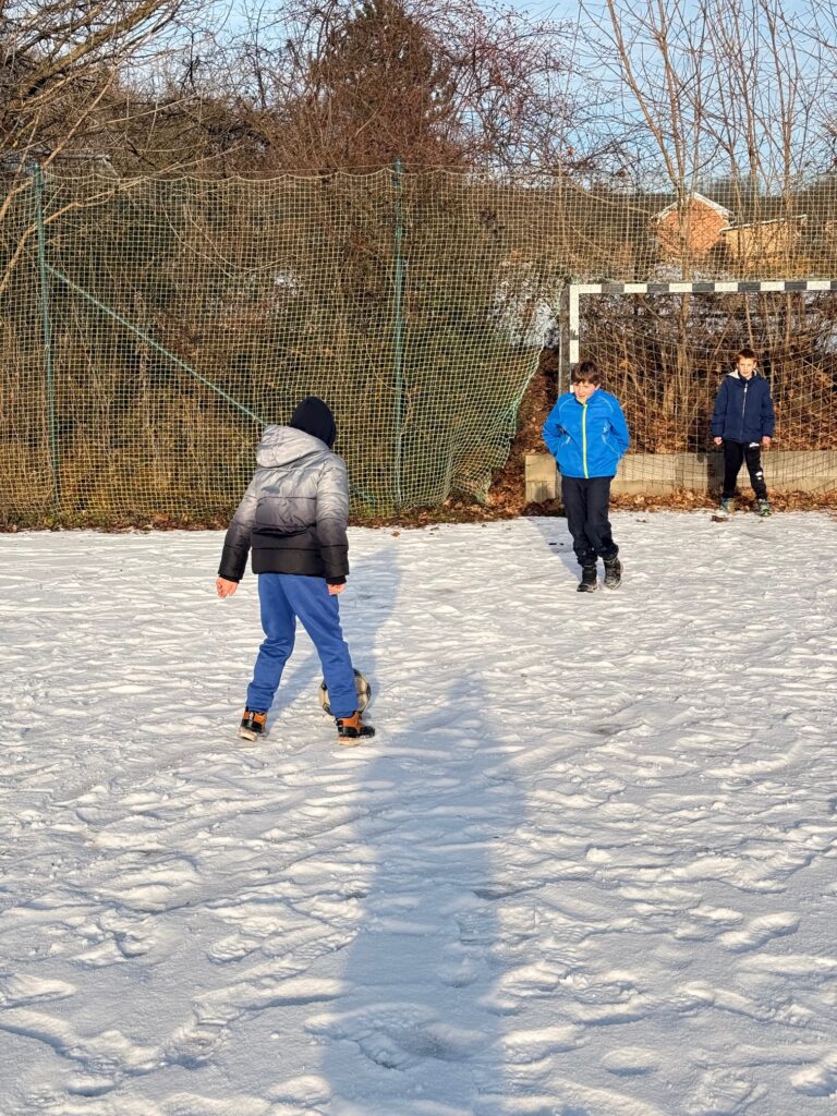 Dvě hodiny tělocviku tentokrát děti nestrávily v teple tělocvičny, ale v pravých zimních podmínkách venku. Místo cvičení na nářadí si užívaly přírodní radovánky, které jim připravila zasněžená krajina. Nejprve jsme se vydali na příjemnou procházku, během níž si děti vychutnávaly čerstvý vzduch, křupající sníh pod nohama a zimní atmosféru. Později se kluci s nadšením pustili do fotbalu ve sněhu na zasněženém hřišti. I když byl pohyb náročnější než obvykle, nechyběl smích, soutěživost ani dobrá nálada. Zimní tělocvik venku se tak stal krásným zpestřením a důkazem, že sportovat se dá za každého počasí. ❄️⚽