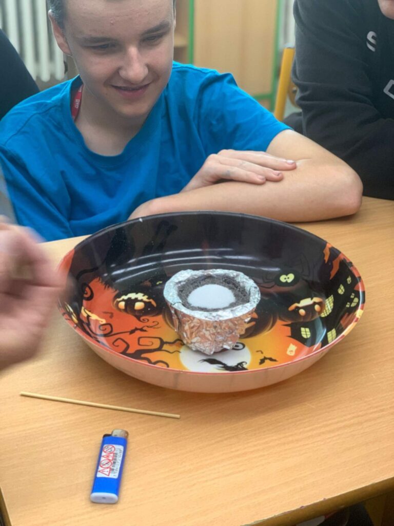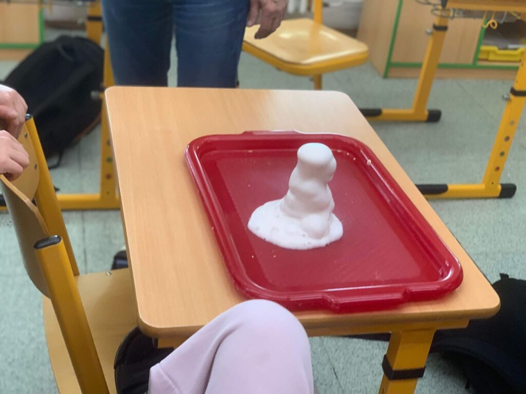 Dalším experimentem byla chemická sopka, která simulovala sopečnou erupci. Barevná pěna „vybuchující“ z nádoby připomínala skutečnou lávu a žáci si tak mohli názorně představit chemickou reakci doprovázenou uvolňováním plynu.