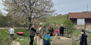 Něco se chystá, v listopadu nám přivezli na paletě betonové záhony. V dubnu jsme se pustili do práce, jaro nás volalo do přírody. Postavit záhon z těžkých dílů pomohli větší …